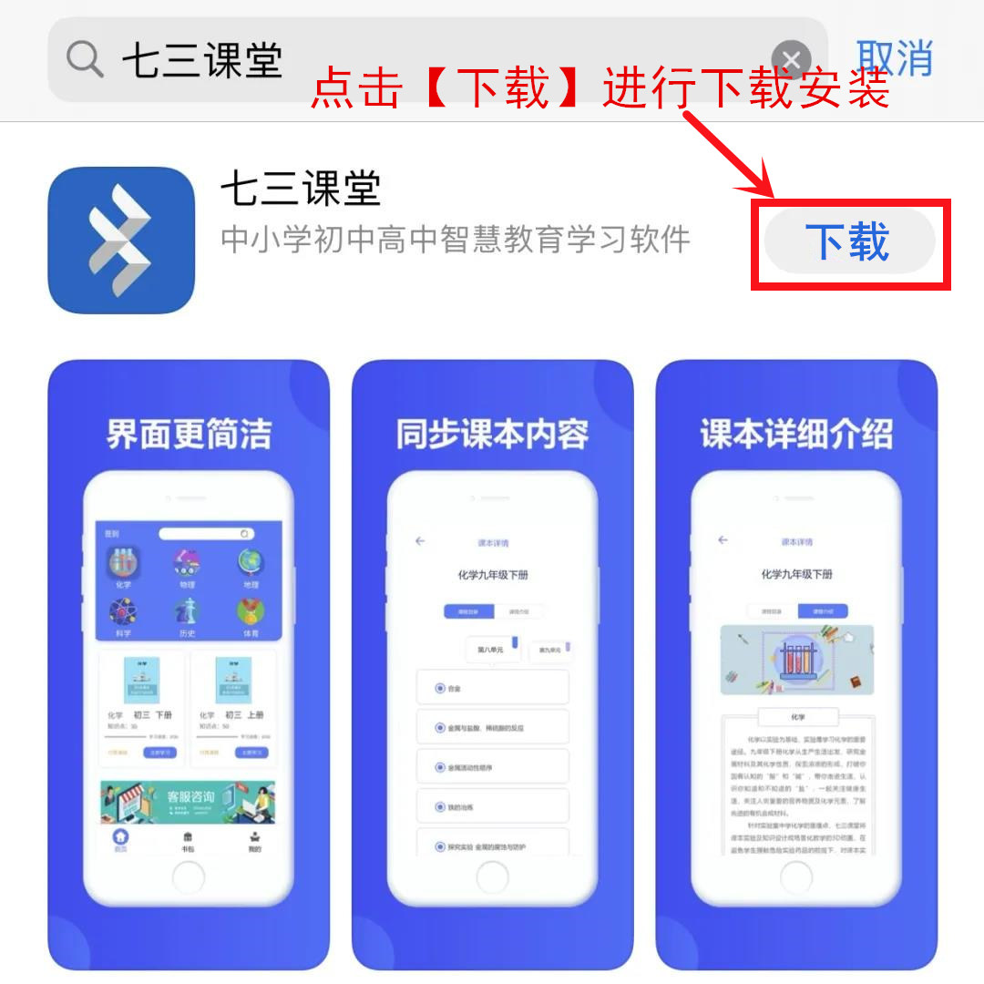 01.点击首页【App Store】→02.输入“七三课堂”点击搜索→03.找到【七三课堂】APP点击“下载”按钮进行下载安装→04.安装成功后返回首页,找到【七三课堂】APP点击→进入【七三课堂】页面选择所需的课本就可以学习啦。具体步骤如下图所示: